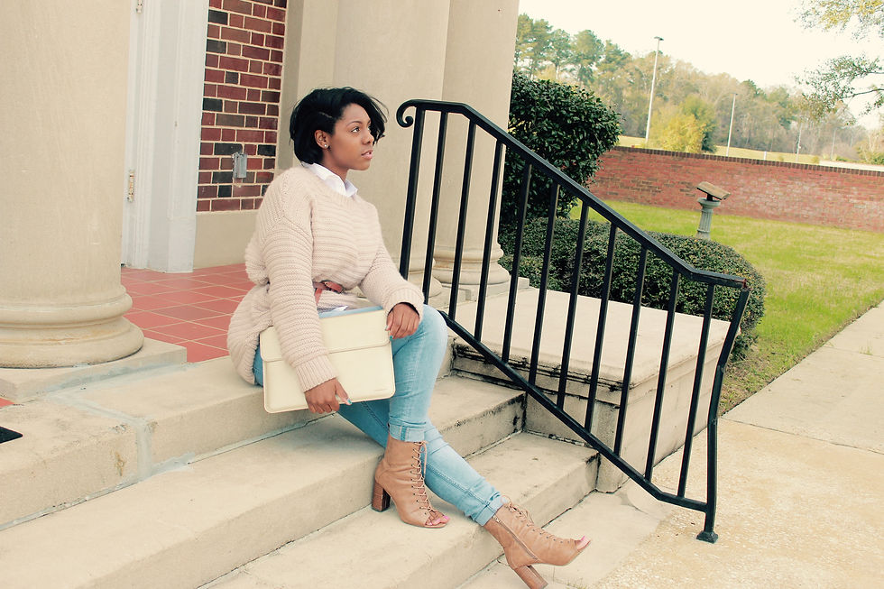 Let's get more into the look. This sweater was purchsed from H&M along with the jeans. My white oxford is from JcPenney. My belt has been in my closet for years. I've always wanted to try the look with the large poncho and a belt wrapped around but I couldn't get it right. So, I decided to try it with a sweater instead. I layered this sweater with my oxford for a classic look. My gold laptop case looks like a clutch, so I modeled it as one! I have one motto for the week : "Be content with the things that you have". A lot of people have the mindset that they must shop when they want to look nice, when in reality, you don't! Buy good pieces and play with your wardrobe. You'll be surprised by how many looks you will come up with!